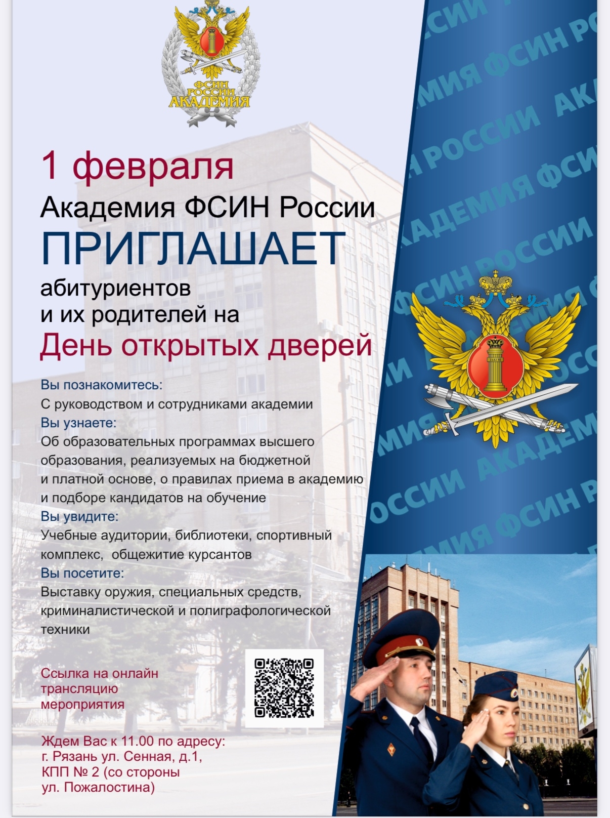 23 января 2026 г.В Академии ФСИН России 1 февраля 2026 г. состоится день открытых дверей для кандидатов на обучение в 2026 году в очном и дистанционном формате.